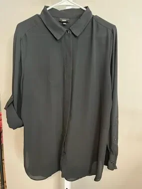 Lightweight long-sleeve button-down blouse with a pointed collar. Hidden front placket for a streamlined look. Roll-tab sleeves for adjustable styling. Flowy silhouette ideal for layering.