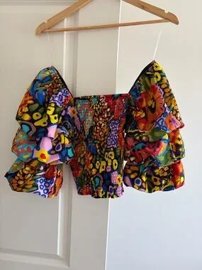 Bold multicolor puff sleeves with vibrant floral and abstract prints. Smocked bodice for a comfortable, fitted feel. Square neckline and statement ruffled sleeves add on-trend flair. Perfect for pairing with high-waist bottoms for a playful, fashion-forward look.