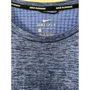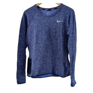 The NIKE Blue Therma Reflective Long Sleeve Zip Pocket Running Top in women's medium is a versatile activewear top suitable for various occasions such as travel, casual outings, and active sports like running and jogging. The pullover style with a crew neck and long sleeves offers both comfort and functionality, while the reflective features enhance visibility during low-light conditions. Made with machine washable fabric, this top is a stylish and practical choice for outdoor activities in all seasons.