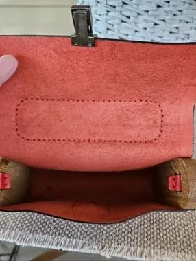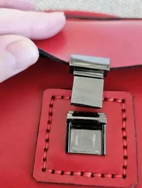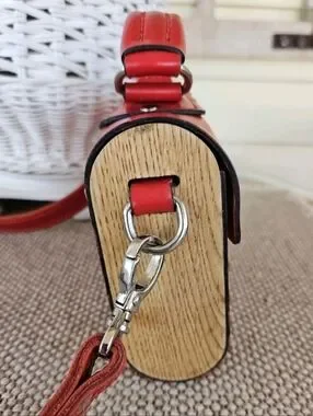 Sleek red leather ( May be faux leather) top-handle crossbody for everyday style. Features a secure front clasp and detachable shoulder strap. Clean, structured silhouette that pairs with casual or dress looks. Red color adds a bold, polished touch. Hand crafted in the Ukraine. Sides of bag are wooden and add an extra nice detail. See photo #2 for measurements