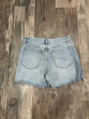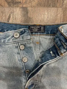 High-rise denim shorts from Abercrombie & Fitch. Light blue wash with distressed detailing and frayed hem. Functional pockets and button fly. Casual, vintage-inspired look.