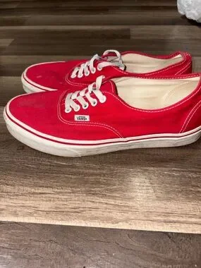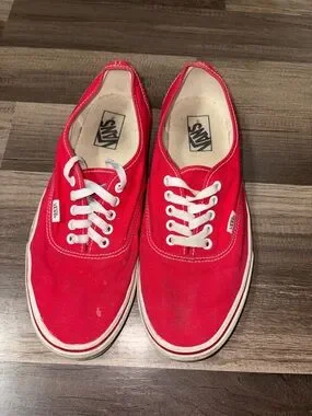 Classic Vans low-top canvas sneakers in bright red. White laces and white rubber midsoles. Clean skate-inspired profile. Versatile casual style.