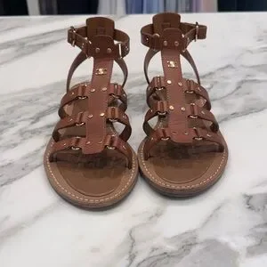 Celine leather gladiator sandals with multiple straps. Gold-tone stud accents and branded logo plaques. Ankle buckle closure for secure fit. Classic versatile style for warm-weather wear.