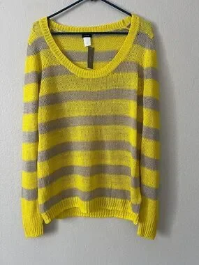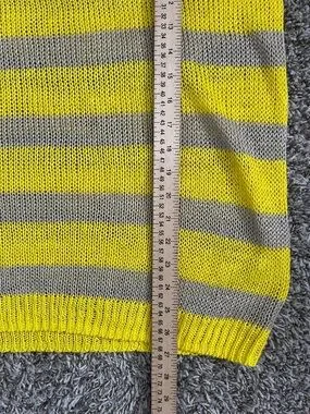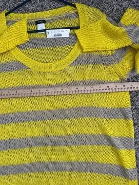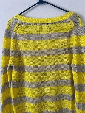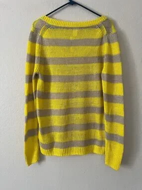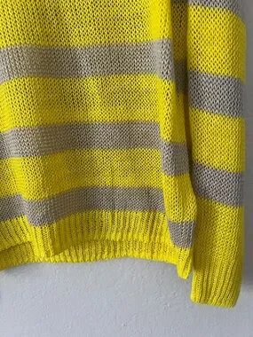 Soft, lightweight knit sweater in bright yellow and taupe stripes. Relaxed fit with a wide scoop neckline for easy layering. Breathable fabric keeps you comfortable all day. Bright yellow stripes add a cheerful, modern touch.