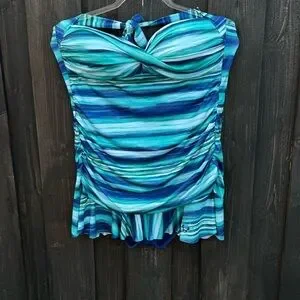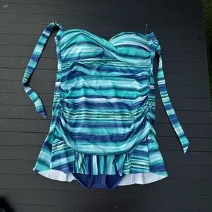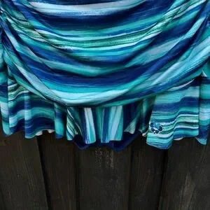 Swimsuit with standard cut under layer and skirted top layer.