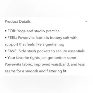 Quality workout pants with a soft buttery feel from the Powervita Fabric. There are side pockets and compression as well . New in excellent condition. Please see last two pictures for added details.