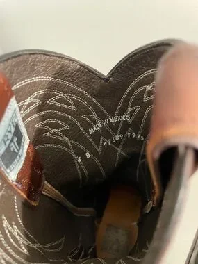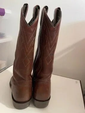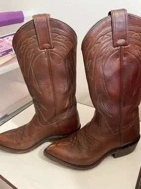 Classic brown leather western cowboy boots. Decorative stitch detailing on the shaft and vamp. Pull tabs for easy on. Timeless western silhouette.