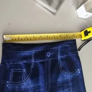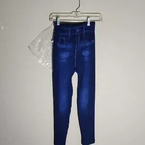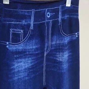 These leggings combine the comfort of stretchy fabric with the stylish appearance of denim. Designed for everyday wear, they offer a polished look with a cozy fit. These are size large and have stretch