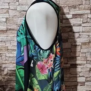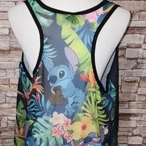 Black tank top featuring a blue cartoon character with green leaves and a brown coconut design. Pre-owned