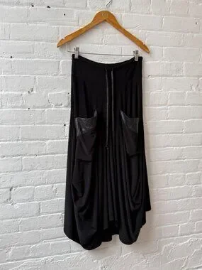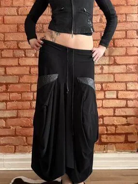 y2k vintage black draped midi skirt with pocket detail ~ tag size small ~ waist 15 inches flat ~ length 35 inches ~ model is 5’10 ~ bundles receive discounts! if you add all the items to cart discount will apply automatically 🤍 ~ shipping from montreal, canada ~ us shipping takes 3-8 days to arrive ~ #blackskirt #minimaliststyle #avantgarde #y2kfashion #streetwear draped flowy midi skirt elastic waistband drawstring detail oversized utility pockets lightweight stretchy fabric asymmetrical hem edgy minimal goth chic normcore elevated basics everyday statement piece layering staple