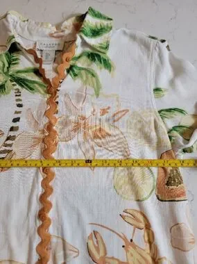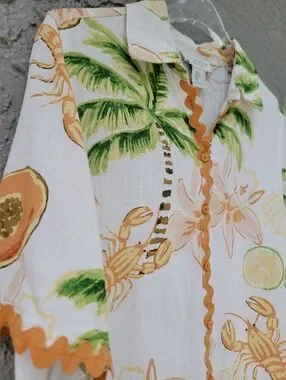 Features a vibrant coastal print with lobsters, palm trees, papaya & citrus, finished with a signature wavy trim (ric rac detail) along the front and sleeves. Lightweight, breathable, and perfect for resortwear, vacation, or effortless summer styling.