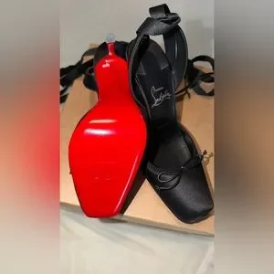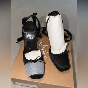 Chic Christian Louboutin pumps in black satin. Ballet toe detail. Ankle tie ribbons for a feminine fit. Ideal for dressy evenings. Brand New (only worn to try on). Comes with box and show cover. Price asked is for what was paid for them. I forgot to return by the return by date. Online receipt from CL in pictures.