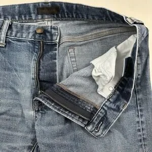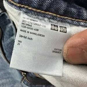 The Uniqlo Kaihara Japanese Selvedge Jeans in size 34x34 are a stylish and comfortable choice for men. Made from a blend of spandex and cotton denim, these slim straight jeans feature a light wash blue color that is versatile for wearing in the summer, fall, and spring seasons. With a low rise waist and a 5-pocket design, these jeans are easy to care for with machine washable instructions. The subtle logo accents add a modern touch to these classic denim pants, perfect for everyday city wear.