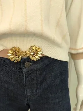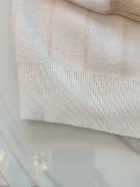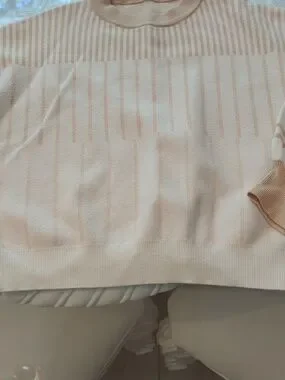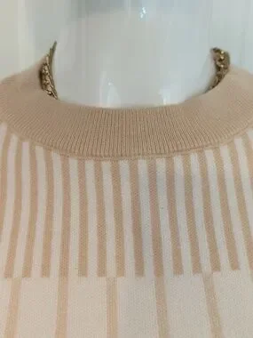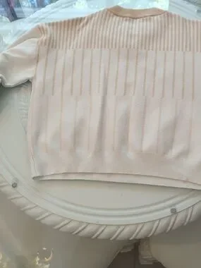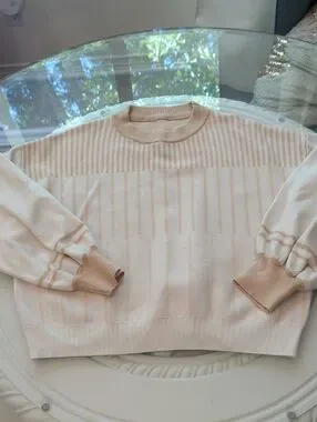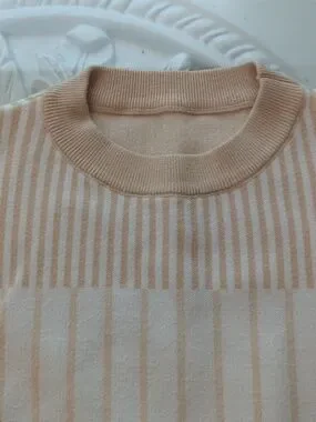 Soft cream sweater with subtle tan stripe detailing. Lightweight knit with a relaxed crewneck and ribbed cuffs. Versatile, everyday staple that pairs well with jeans or skirts. Machine-washable fabric for easy care.