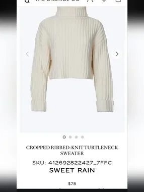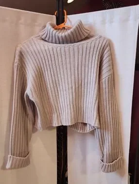 Cozy ribbed knit with a snug turtleneck. Cropped silhouette for modern layering. Long sleeves with rolled cuffs. Soft neutral cream tone for effortless pairing.