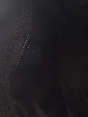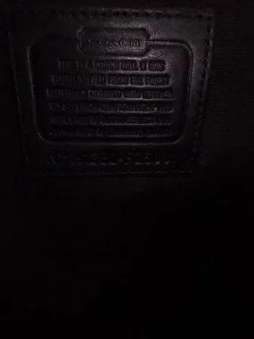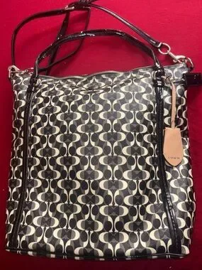 Coach tote featuring bold black and white signature logo print. Black leather straps and trim for a polished look. Top zip closure for security. Includes leather hang tag detail. Great for daily use and versatile styling.