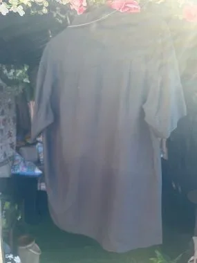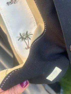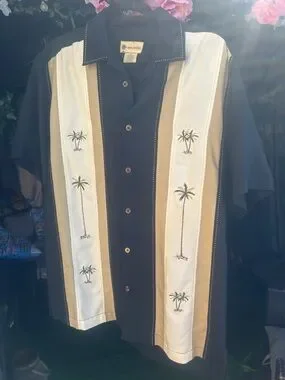 Classic short-sleeve Cuban shirt with vertical cream and tan panels. Embroidered palm tree motifs along front. Button-front styling. Lightweight, breezy fabric.