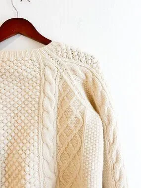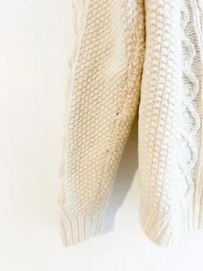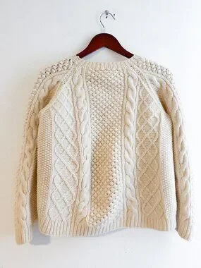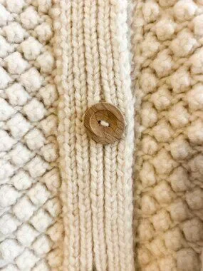 Rich in texture and full of classic heritage charm, this Snowflakes hand knitted cardigan is the kind of substantial wool piece that makes an outfit on its own. Done in a soft cream/ivory shade, it features an intricate mix of traditional fisherman-inspired stitchwork, including chunky cable knit panels, diamond knit detailing, raised bobble/popcorn texture, and dense seed- or moss-style textured sections that give the sweater beautiful dimension throughout.
