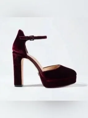 Elegant White House Black Market ankle-strap pumps in rich burgundy velvet. Platform sole and block heel for added height and stable comfort. Soft velvet upper offers a luxe look for evening or special occasions. Excellent condition.