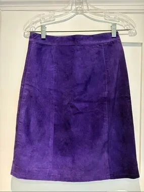 Classic A-line skirt in rich purple suede. Soft suede finish for a refined, wearable look. Flattering panel construction creates a smooth silhouette. Easy to pair with blouses or knitwear for polished outfits.