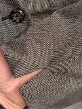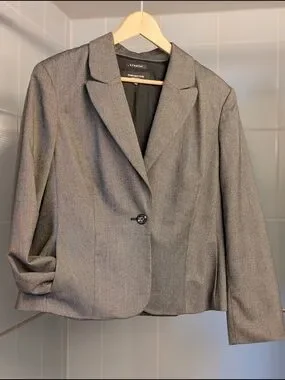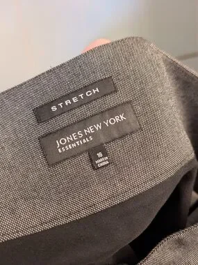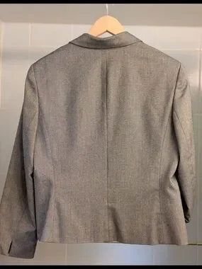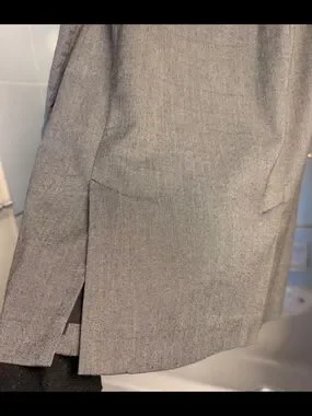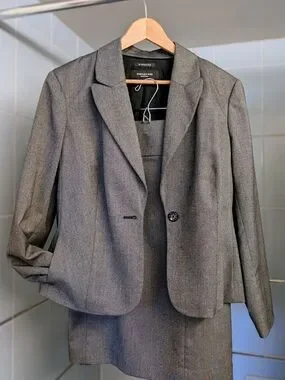 Classic gray skirt suit in flexible, easy-wearing, medium-weight fabric. Single-button blazer with notch lapel. Matching pencil skirt with double slits. Sleek professional look. Versatile wardrobe staple.