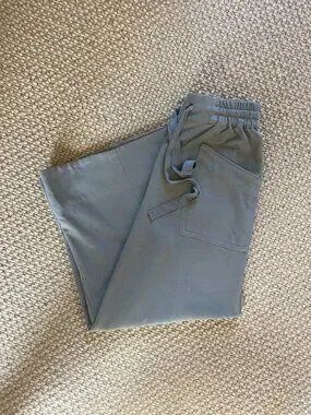 Wide leg Polyester, viscose, elastane Front slant pockets Back patch pockets Pull-on styling; tie waist Machine wash Grey neutral Measures approximately Waist 16” flat across Inseam 29” Rise 13.75” Ankle 15”