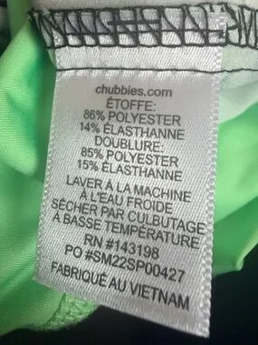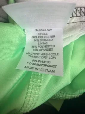 Chubbies men’s swim trunks in size small featuring a bold striped colorblock design in black, pink, and mint green. Classic 5.5” inseam for a modern, above-the-knee fit. Built-in liner provides comfort and support, with slight visibility at the hem as part of the style.