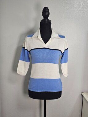 Pink Soda Retro Striped Knit Top Blue White Y2K Preppy Polo Collar 3/4 Sleeve