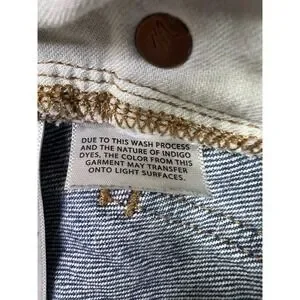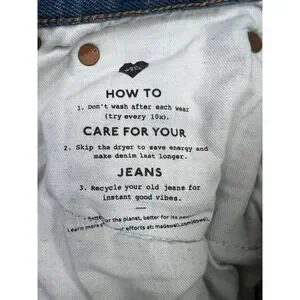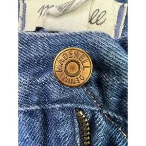 Pre-owned Madewell Baggy Straight jeans with light overall wear and mild wash fading from normal use. Denim fabric, seams, belt loops, hems, zipper, and Madewell logo button are clean and intact with no stains, holes, or fraying, and all five pockets are functional. Interior Madewell brand, size, fiber content, care, and Fair Trade Certified factory tags are present and legible.