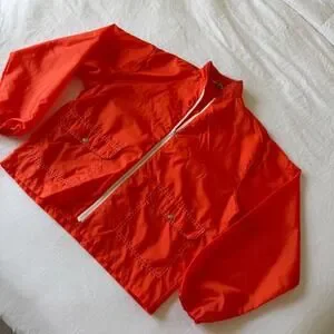 Vintage Surf Jockey windbreaker jacket in a vibrant orange hue. This lightweight piece features a full-zip front with a contrasting white Talon zipper and a classic stand-up collar. Designed with two front utility pockets with snap closures and white contrast stitching throughout for a retro surf-inspired look.