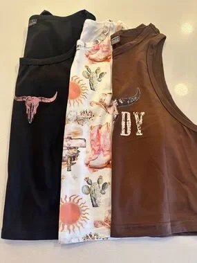 Three sleeveless crop tanks with Western-inspired prints. One solid black with bull skull motif. One white with multi-tone desert and sun pattern. One brown with distressed cow skull and "HOWDY" text. Easy casual tops for pairing with high-waist jeans or skirts.
