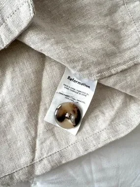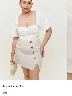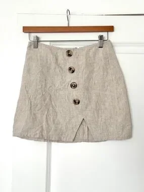 Classic mini skirt. Front button closure with tortoiseshell-style buttons. Small front slit for movement. 100% linen.