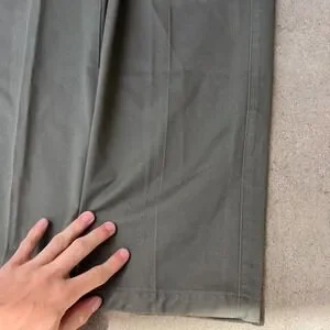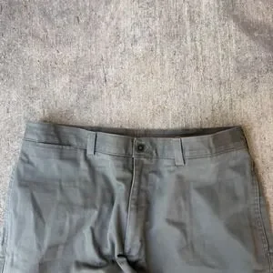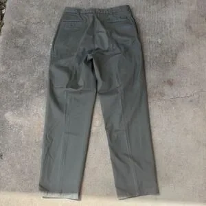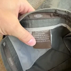 Savane mens flat front chino pants in a versatile olive green. These 100% cotton trousers feature a classic straight leg silhouette with a clean flat front and functional belt loops. Perfect for business casual wear or everyday styling, they offer a comfortable fit and durable construction. Note some minor spotting on the lower leg area.