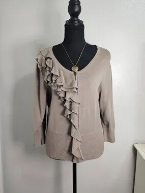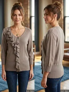 Elevate your essentials with this chic and feminine cardigan from Elle. Featuring a unique asymmetrical ruffle detail and a sleek zip-front closure, this piece perfectly balances classic knitwear with modern flair. The neutral taupe/mushroom hue makes it an incredibly versatile layering piece for transitional weather.
