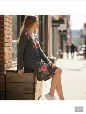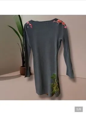 Elegant long sleeve dress with vibrant floral embroidery. Features red and pink flowers on a gray background. Perfect for stylish occasions.
