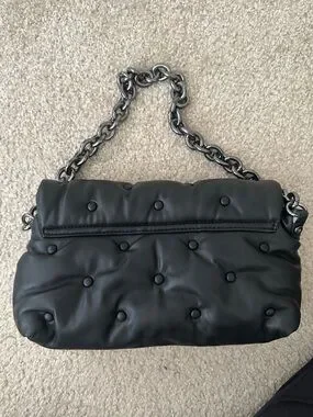 Soft quilted exterior with button-tufted detailing. Features a bold gunmetal chain strap. Sleek black design for versatile wear.
