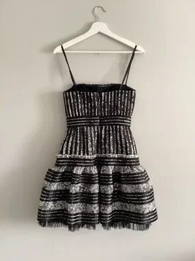 BCBG MaxAzria ‘Madeline’ Structured Strapless Dress, Size 2 Black/white Flair skirt with lace bottom Built in bone for support Lined with mesh/tulle for volume Silicone tubing bust strip Hidden back zipper Pit - pit 15.5” Waist 13.5” Length 26.5” All measurements approximate Gorgeous dress in excellent condition