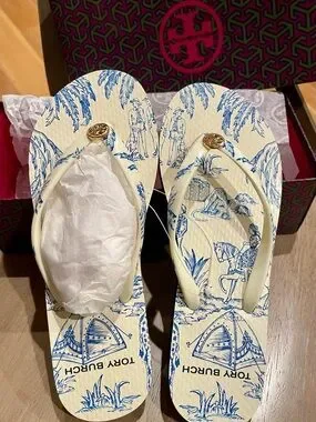 Tory Burch Cream & Blue Printed Flip Flops - size 5 (NWT)