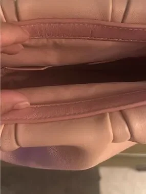Soft blush pink shoulder bag with padded, pleated body. Glossy pink resin chain accent and gold-tone hardware. Includes detachable strap for crossbody or shoulder wear. Feminine, modern silhouette.