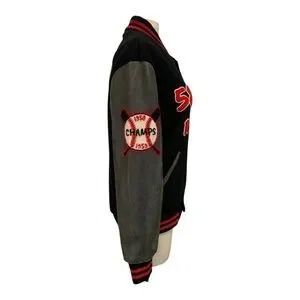 Features: This is a high end designer wool blend letterman style jacket from the streetwear brand LF. Features: Patchwork throughout, Genuine leather sleeves, cuffed wrists and botton hem, Lined, and snap closure.