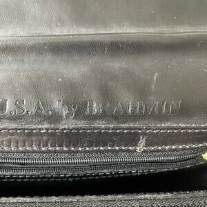 Early classic Brahmin bag, smooth leather and crocodile embossed leather accents, mostly black with brown accents, includes hangtag, made in USA, magnetic snap closure, main compartments, 2 zip compartments, slip pocket on back, note some scuffs and signs of wear to corners
