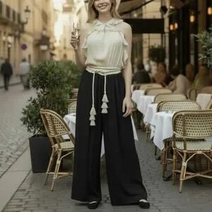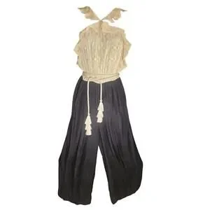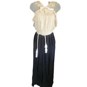 Rachel Zoe Ivory Black Halter Jumpsuit SZ 6 Ruffled Slraps Silk Tassled Tie NWT