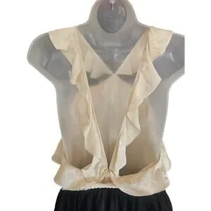 Rachel Zoe Halter Jumpsuit in ivory and black. Ruffled straps and tasseled waist tie. Top portion is 100% silk and the bottom slacks portion is 68% silk and 32% viscose. Dry clean only. New with tags, Open ruffled back and side pockets. Measures 34 bust x 26.5 inseam x 25 elastic waist in completely relaxed position (will stretch to 31) Size 6