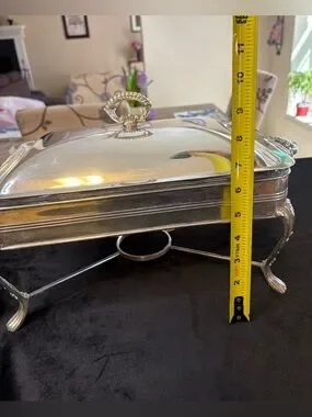 Elegant silver-tone chafing dish with decorative lid and sturdy stand. Keeps food warm while adding a refined touch to your table. Easy to fill and serve from the removable pan. Ideal for entertaining and family gatherings.