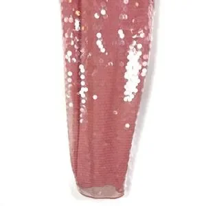 A stunning strapless maxi gown in a beautiful Sienna pink hue, adorned with shimmering circular sequins throughout. This elegant dress features a sleek, form-fitting silhouette that flows gracefully to the floor. The sequined overlay creates a captivating, eye-catching effect, perfect for making a statement. A discreet zipper closure ensures a seamless look.