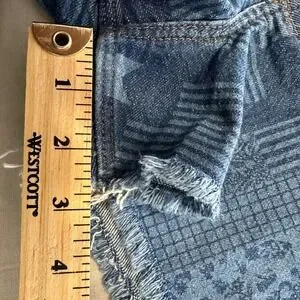 Wrangler denim shorts feature a unique patchwork-inspired print with stars, floral motifs, and geometric patterns throughout. These vintage-style shorts are designed with a classic five-pocket construction, a zip fly with button closure, and a raw, frayed hem for a lived-in look. The stretch denim blend ensures a comfortable fit while maintaining a structured silhouette.