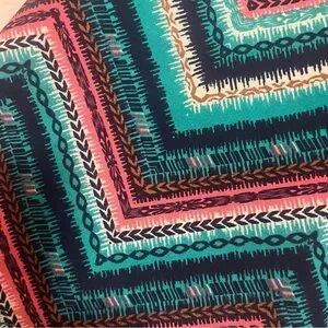 Navy, Teal, coral pink, and white colors with navy crocheted fringe.
