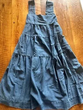 Soft denim dress with a tiered A-line skirt. Wide straps and a fitted bodice. Breezy movement and casual charm. Easy to style for everyday wear.