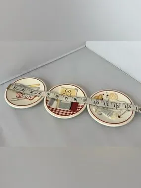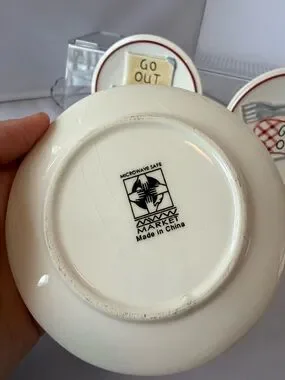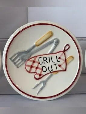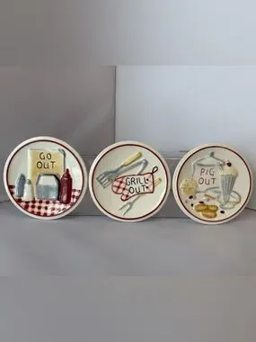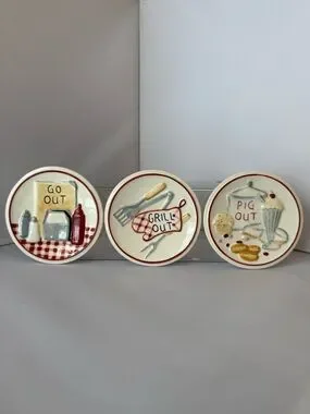 Set of 3 MWW Market 4.5” ceramic plates with raised diner-style motifs feature dinner choices like Grilling, Going out or Pigging out. Classic picnic style cream background with red rim accents. Microwave-safe ceramic finish. Great for casual table settings.
