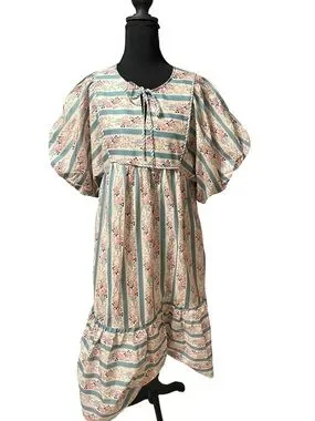This Entro cottage core dress in size Medium is the perfect blend of vintage charm and effortless femininity. Designed with a soft cream base, it features delicate floral prints layered over muted blue and sage-toned stripes, creating a beautifully romantic, heirloom-inspired look. The bodice showcases a relaxed, slightly structured fit with subtle pleating and a dainty tie neckline that adds just the right touch of detail. The statement puff sleeves bring volume and softness, enhancing the overall silhouette while maintaining a comfortable, breathable feel.
